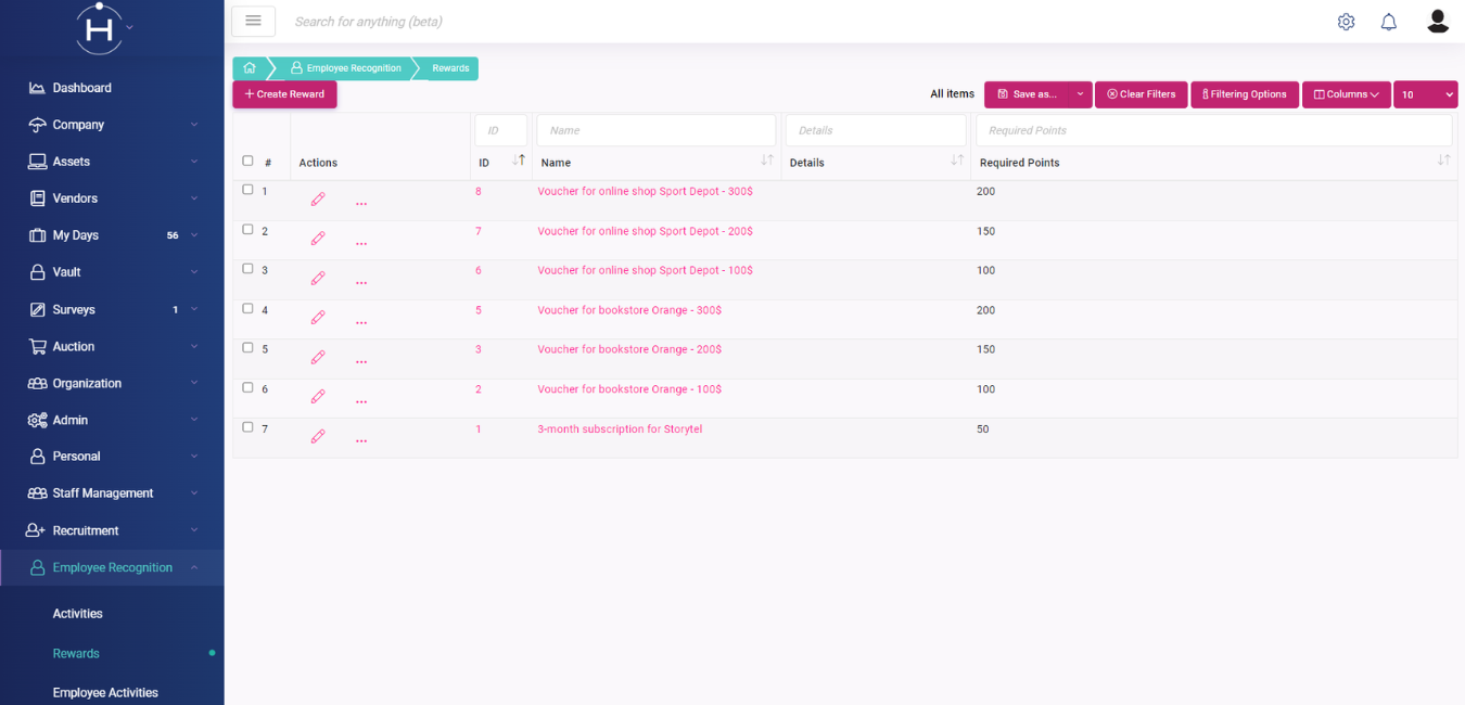 В Employee Recognition модула на Hydrogen София и нейният екип лесно и бързо задават предварително различен тип активности, за които служителите могат да получават бонус точки. Такива активности са например участие в дарителски и доброволчески инициативи, вътрешни събития на компанията, PR активности в социалните медии и други. Към всяка активност HR представителите могат да добавят типа на дейността, определения брой бонус точки за извършване на тази активност, както и всякакви други необходими детайли.
