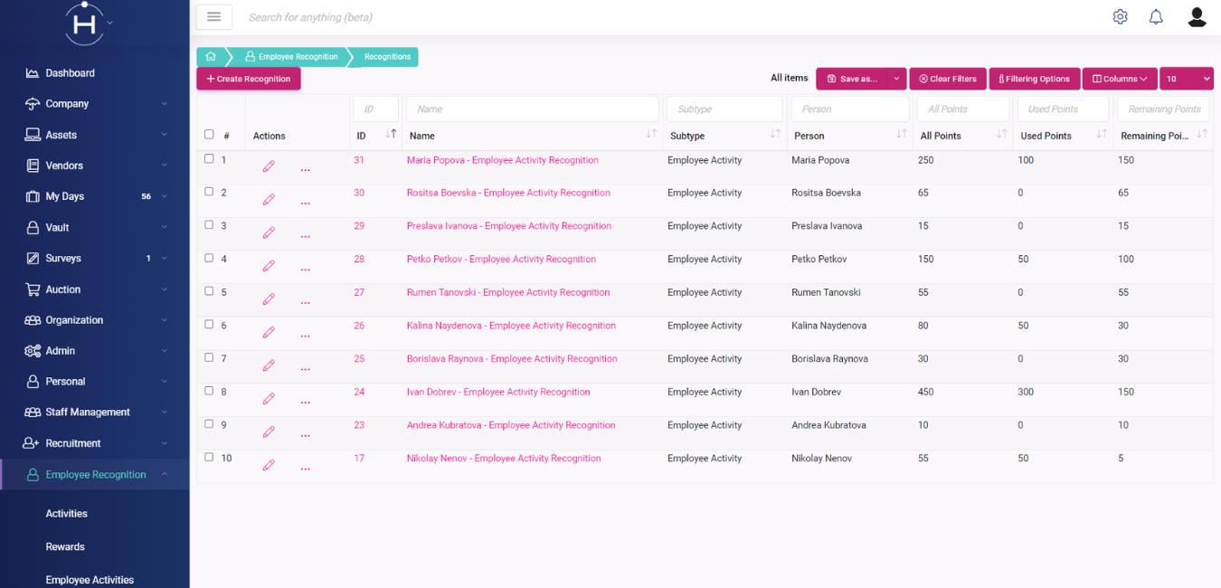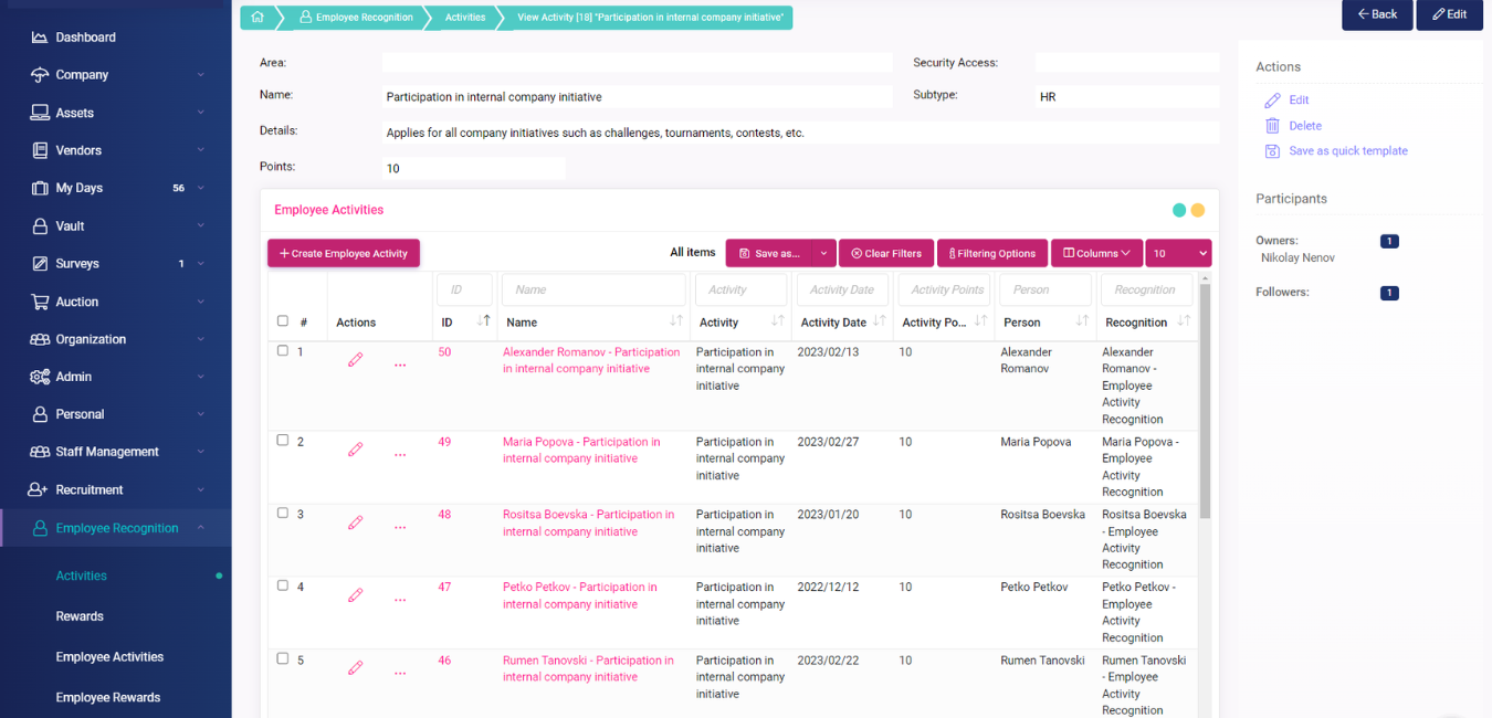 След като имат въведени всички активности и награди в платформата, София и екипът ѝ лесно отбелязват и менажират вече извършените активности от конкретни служители, на едно място. Там те също така могат удобно да филтрират информацията по различни критерии.